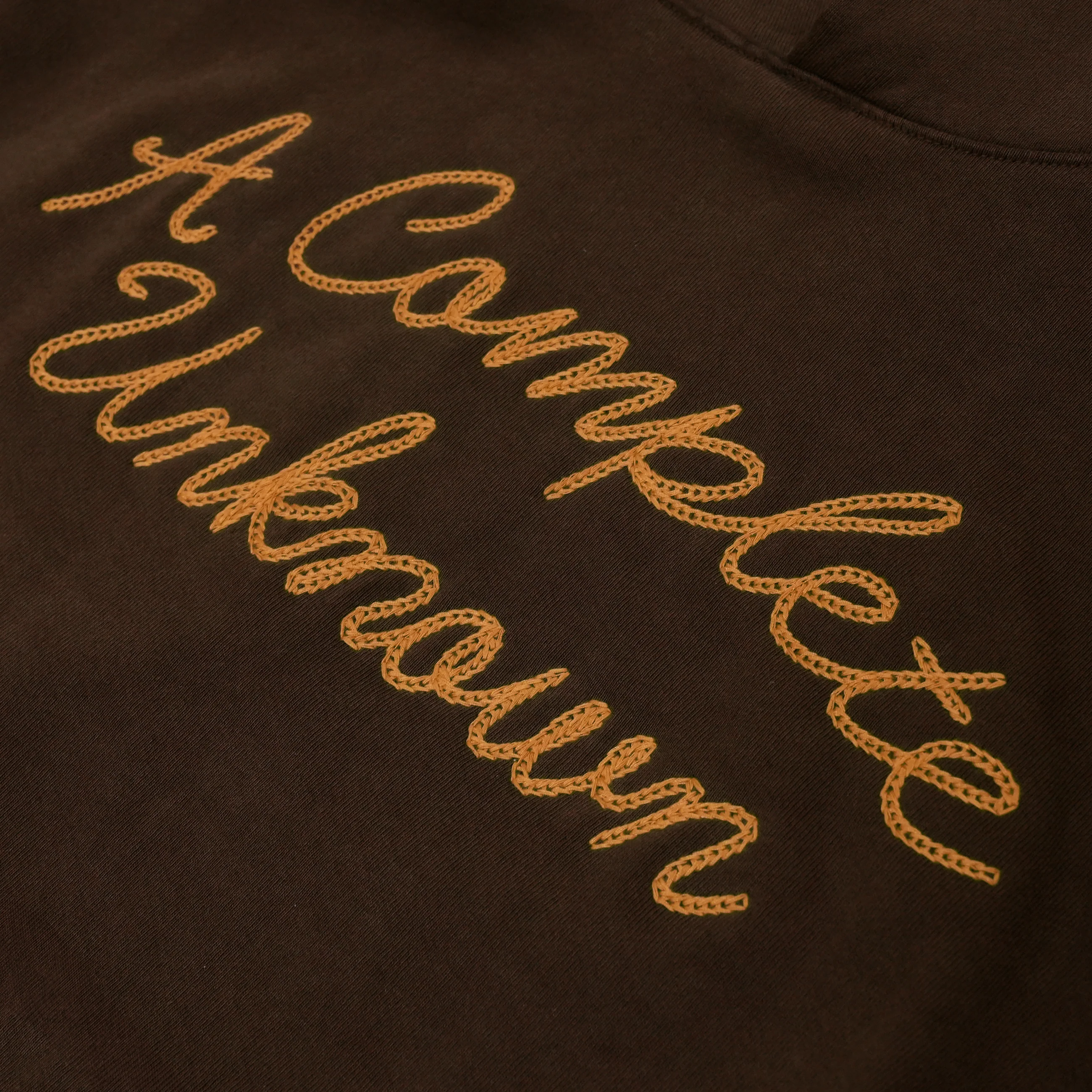Premium 100% cotton hooded sweatshirt. Chain stitch embroidered A Complete Unknown graphic on front chest.